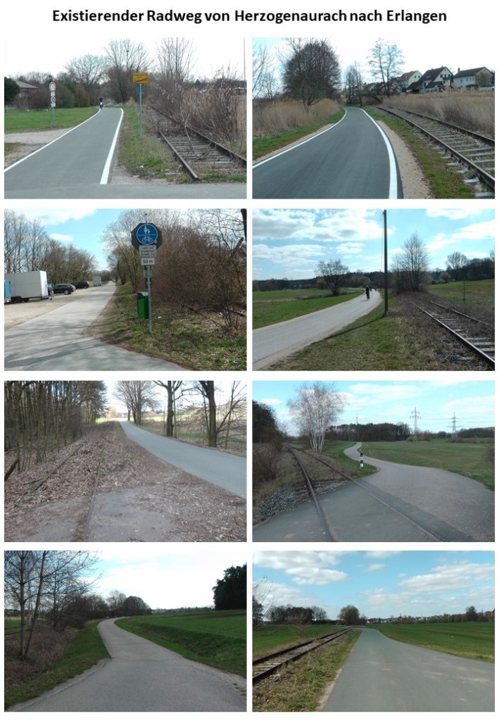 Unter diesen Randbedingungen ist es nicht nachvollziehbar, dafür die Trasse der Aurachtalbahn zu opfern, insbesondere vor dem Hintergrund, dass auf Herzogenauracher Gebiet bereits ein „gut befahrbarer“ Radweg, parallel zur Bahntrasse, existiert, belegt durch nachfolgende Fotostrecke.